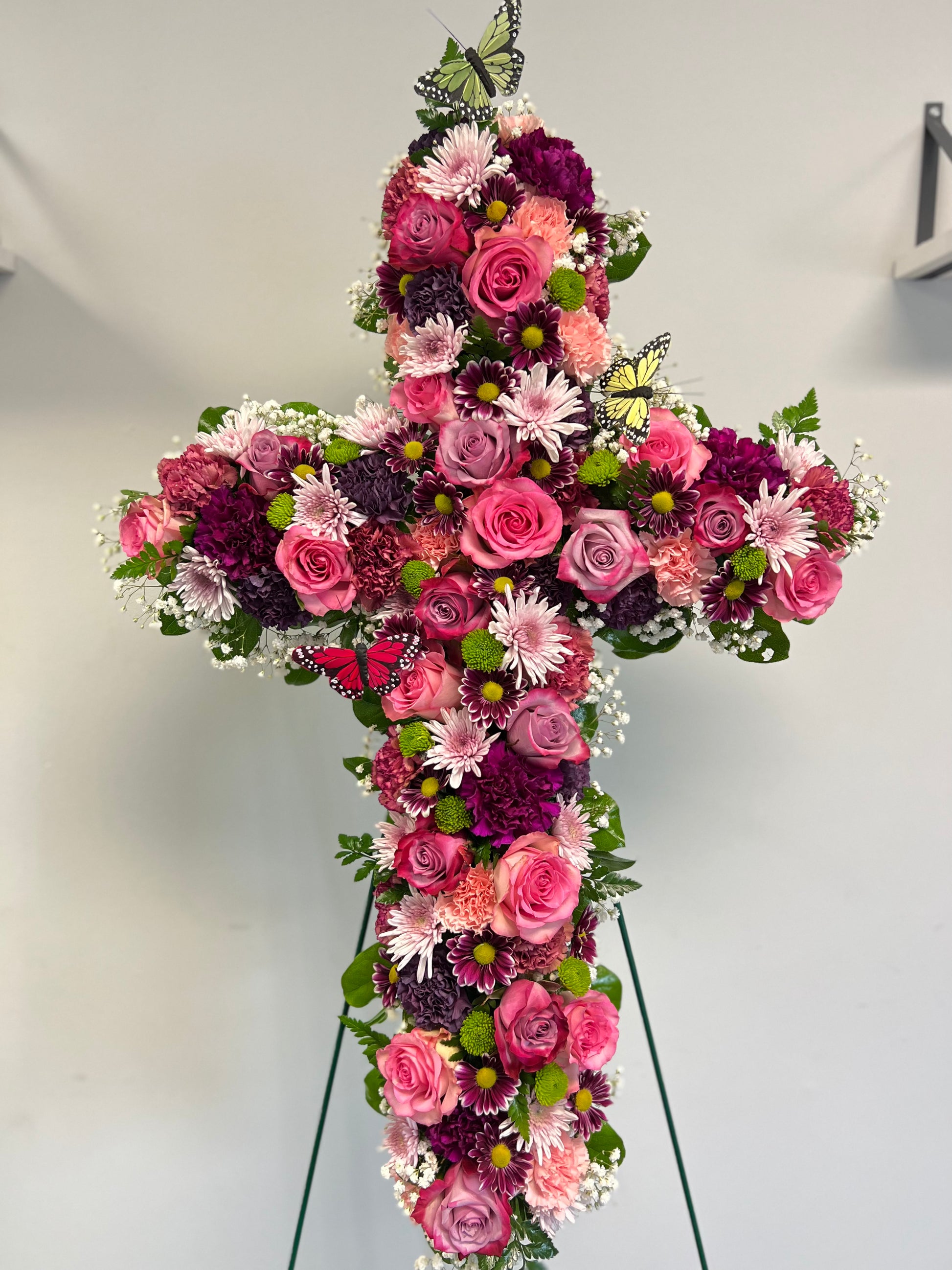 Pastel and deep magenta roses, carnations, and mums in a Grace-filled Cross.